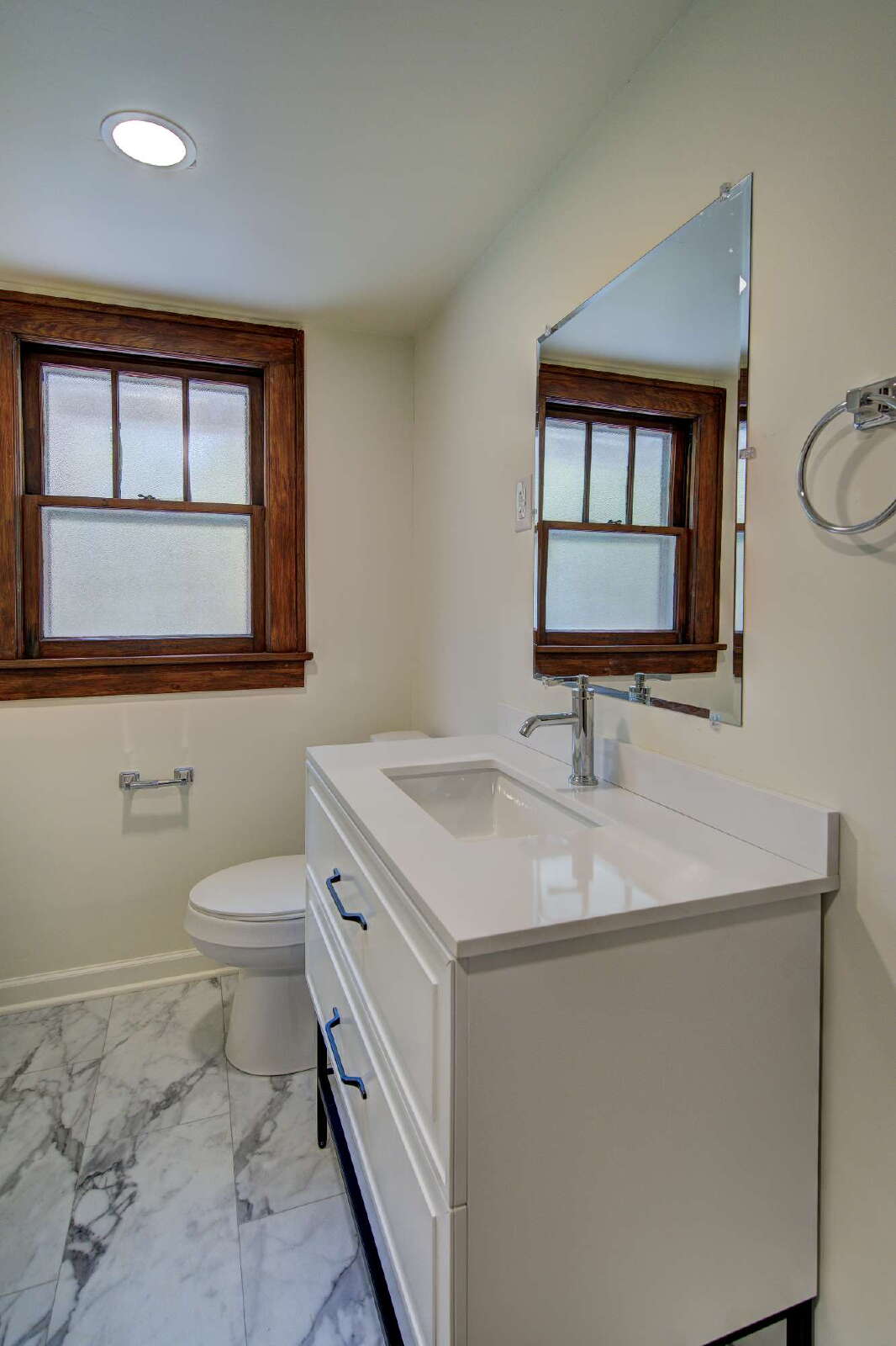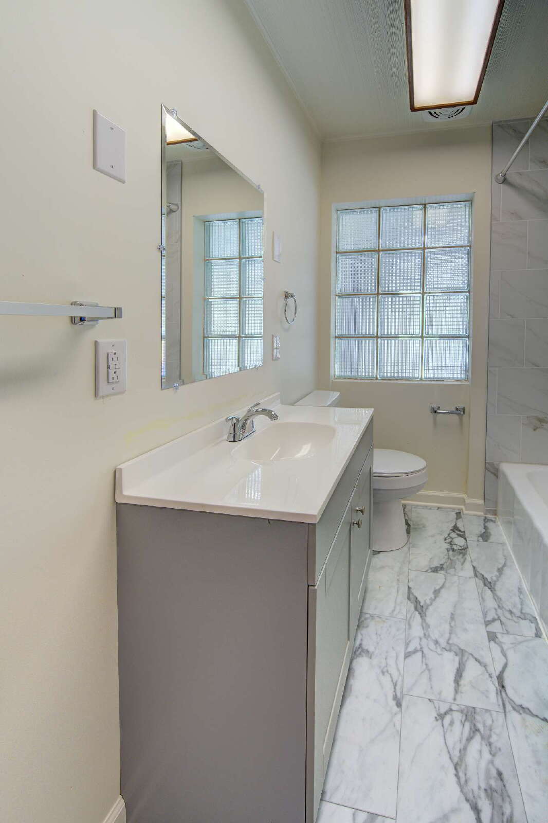 new vanities, and modern finishes. The home has all-new plumbing and electrical, plus a freshly painted exterior. Covered front porch adds charm, while included